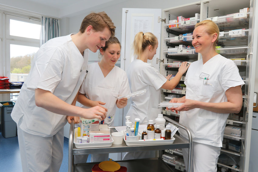 Was heißt Schulstation eigentlich? Auszubildende im dritten Lehrjahr übernehmen im pflegerischen Bereich auf der kompletten Station das Ruder. Auf diese Weise werden Schülerinnen und Schüler auf ihre Arbeit im Stationsalltag vorbereitet. Sie handeln eigenverantwortlich und übernehmen alle Pflegeaufgaben des bisherigen Stationsteams. Im Hintergrund stehen etablierte Kräfte bereit, um zu helfen.