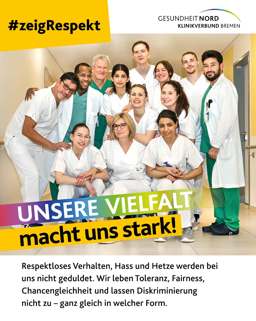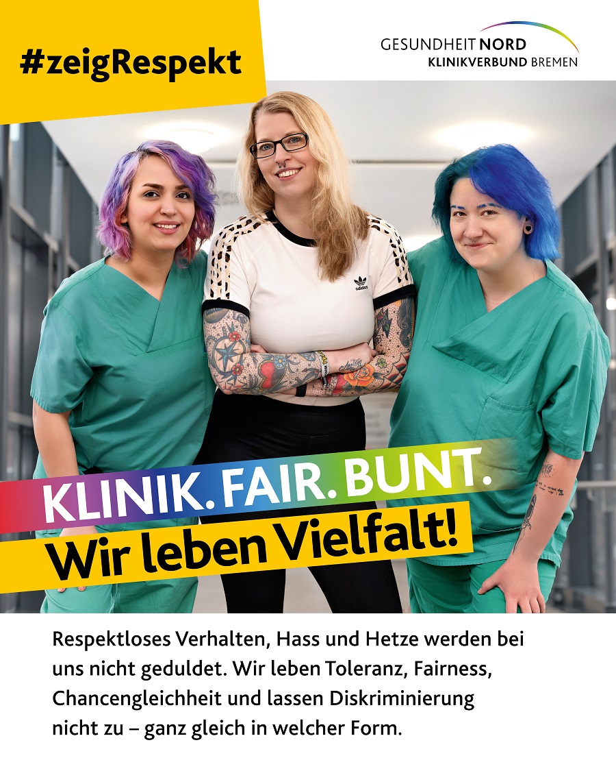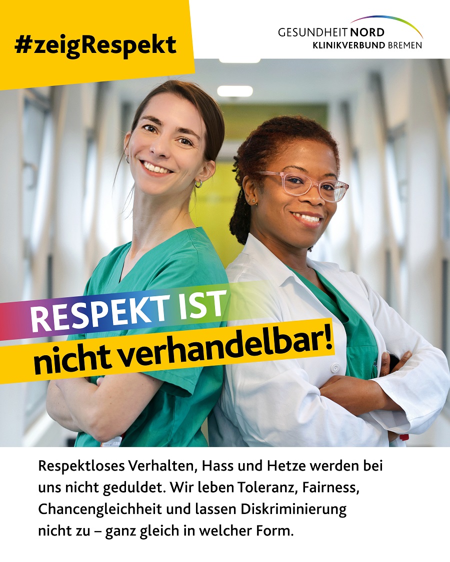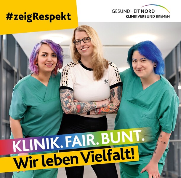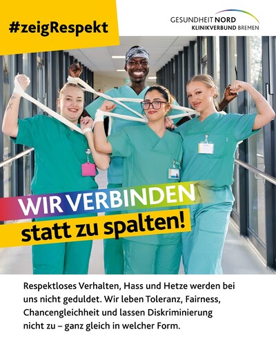 Mit dem Slogan #ZeigRespekt setzt eine neue Kampagne der Gesundheit Nord Zeichen gegen Diskriminierung und für ein respektvolles Miteinander. Auf sieben Plakatmotiven werben Kolleginnen und Kollegen aus dem Klinikverbund für Werte wie Toleranz und Respekt. Die Kampagne zeigt zudem auf, welche Anlaufstellen es im Klinikverbund für Betroffene gibt.