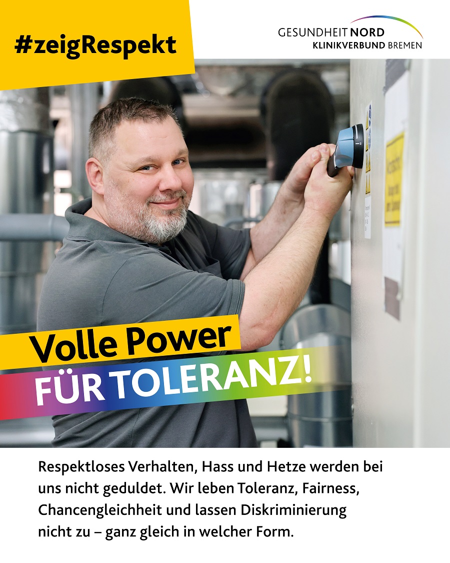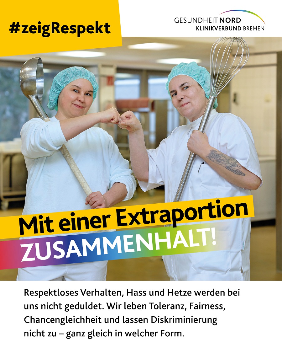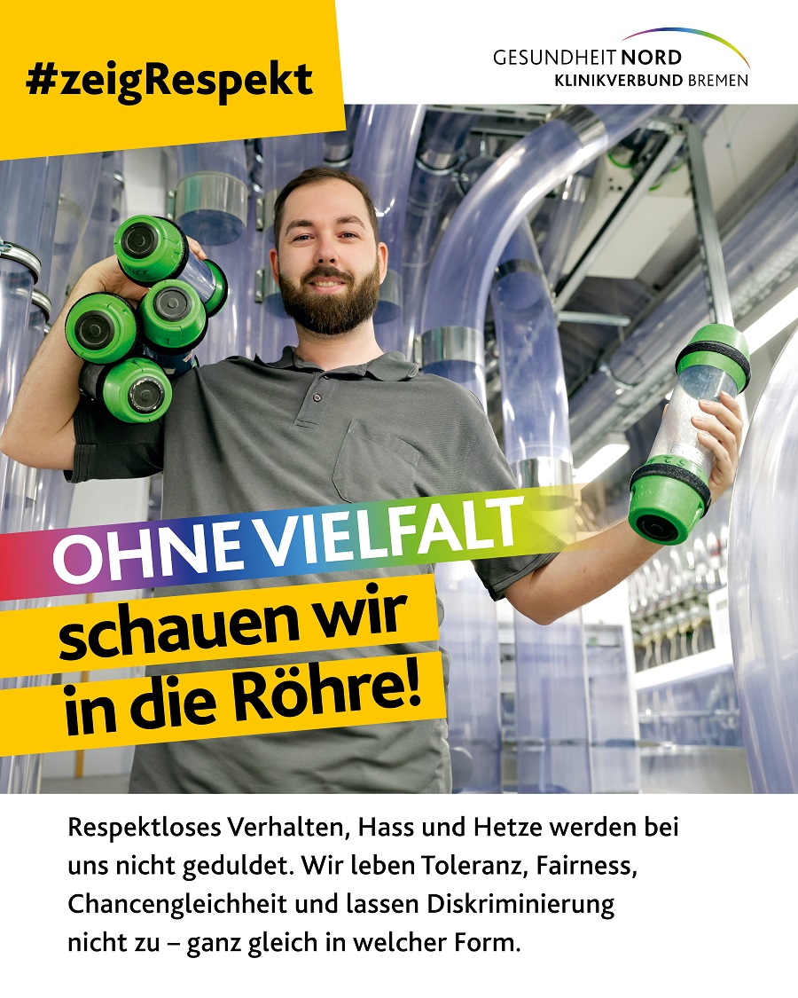 Mit dem Slogan #ZeigRespekt setzt eine neue Kampagne der Gesundheit Nord Zeichen gegen Diskriminierung und für ein respektvolles Miteinander. Auf sieben Plakatmotiven werben Kolleginnen und Kollegen aus dem Klinikverbund für Werte wie Toleranz und Respekt. Die Kampagne zeigt zudem auf, welche Anlaufstellen es im Klinikverbund für Betroffene gibt.
