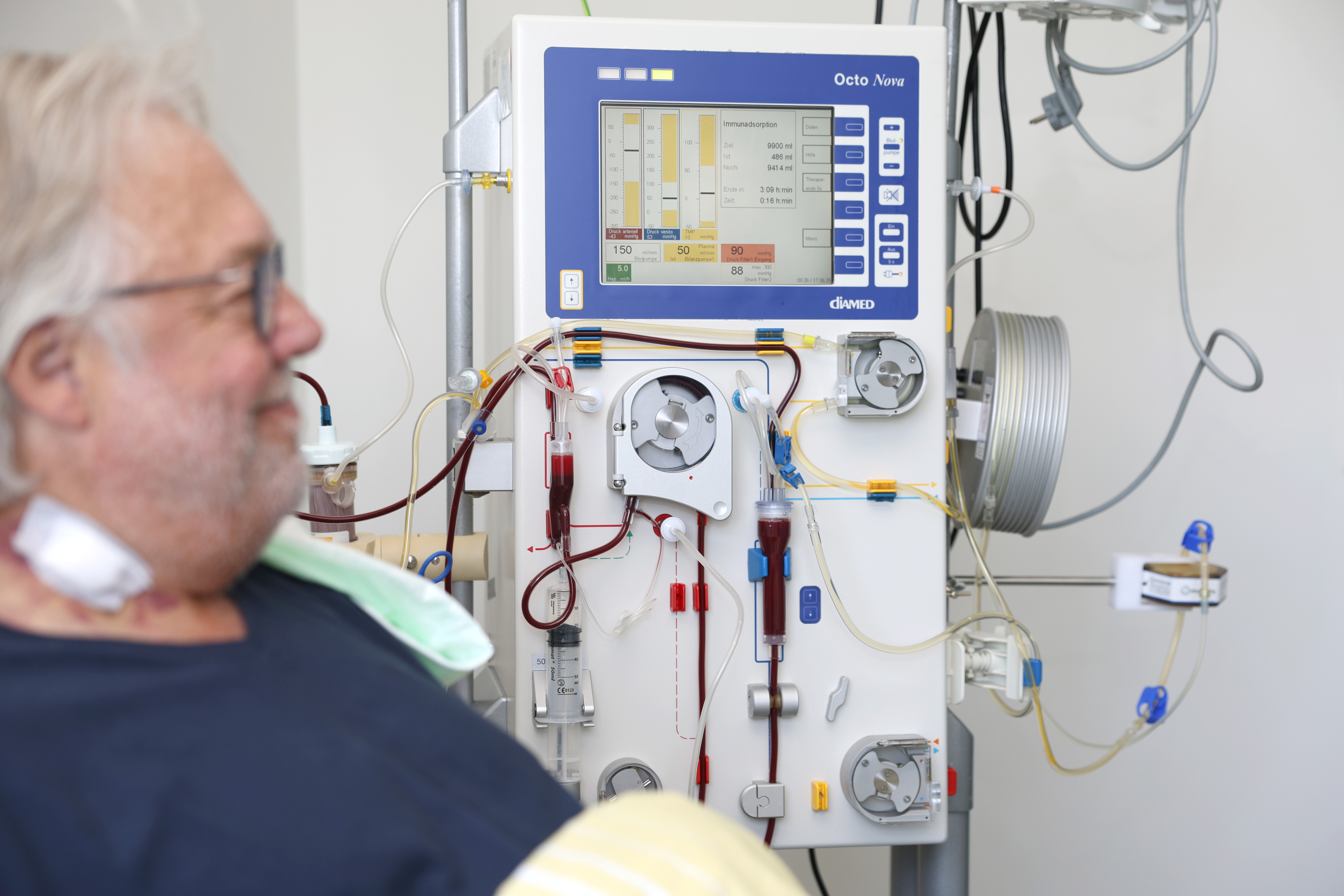 Möglich wurde das durch ein spezielles Verfahren, dass nun erstmals in Bremen zum Einsatz kam und im Transplantationszentrum des Klinikums Bremen-Mitte etabliert wurde. Die sogenannte AB0-Immunadsorption: Über ein spezielles Gerät wird das Immunsystem des Organempfängers für die Transplantation vorbereitet. Dabei kommen je nach Blutgruppen-Kombination bestimmte Adsorber zum Einsatz. „Bei dem Verfahren werden die Antikörper, die sonst später eine Abstoßungsreaktion auslösen würden, aus dem Blut herausgezogen“, sagt Prof. Dr. Jens Lutz, Chefarzt der Medizinischen Klinik III, zu der die Nephrologie - also die Nierenheilkunde - gehört. Lutz hatte das Verfahren, das Anfang der 2000er Jahre erstmals in Freiburg angewandt wurde, auch schon während seiner Zeit in München eingeführt.