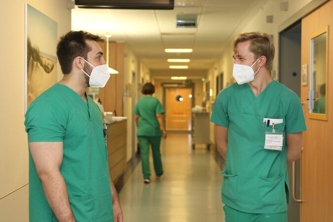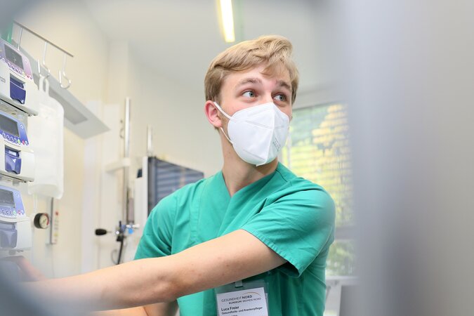 Es liegen spannende Wochen hinter Stefan Mixa und Luca Freier. Die beiden frisch examinierten Pflegekräfte sind neu im Team der Intensivstation am Klinikum Bremen-Nord. Im Sommer erst hatten sie wie viele weitere Pflege-Azubis der Gesundheit Nord erfolgreich ihre Prüfungen zum Examen abgelegt. Und wie einige andere haben sie sich für ihren beruflichen Start eine der Intensivstationen im Klinikverbund ausgesucht; einen Bereich also, der in den vergangenen Pandemie-Monaten besonders im medialen Fokus stand und aktuell weiterhin steht. Doch nicht Corona, sondern „die Praxiseinsätze während der Ausbildung waren für mich entscheidend“, begründet Luca Freier seinen Entschluss für den Berufsstart auf der Intensivstation. Er habe riesigen Respekt vor den vielen anspruchsvollen Aufgaben, die täglich auf der Intensivstation auf ihn warten, in einem Krankenhausbereich, in dem die schwer kranken Menschen besonders auf spezielle Versorgung angewiesen sind. „Aber ich bin hier in ein Team gekommen, das einen sehr gut heranführt an die vielen Aufgaben.“