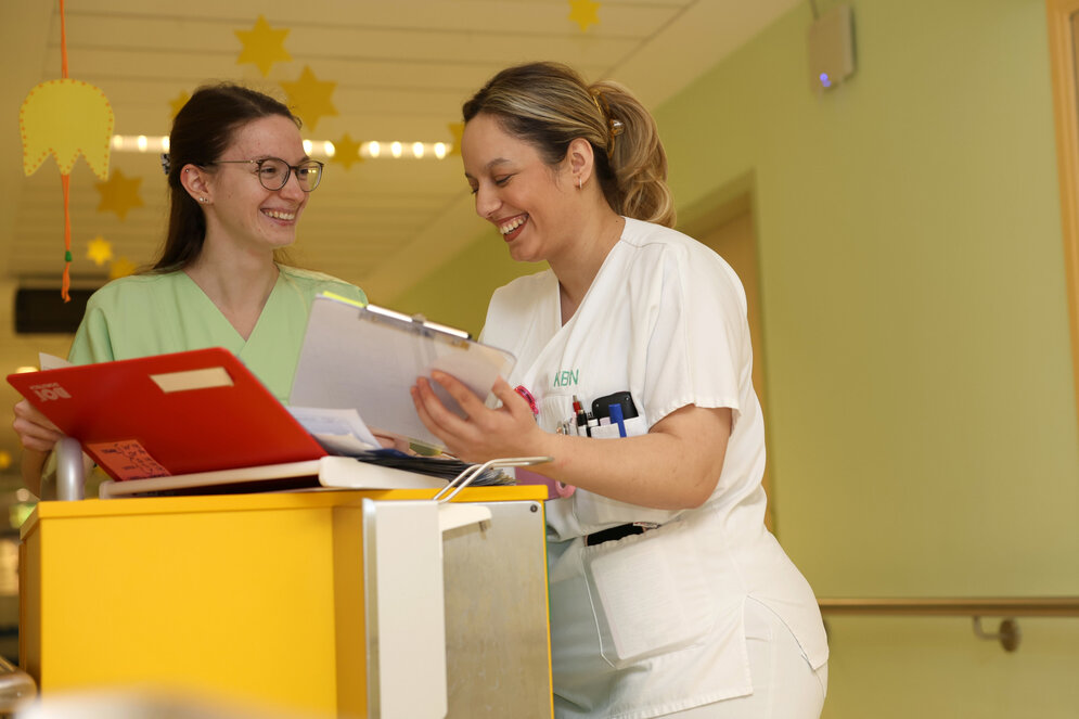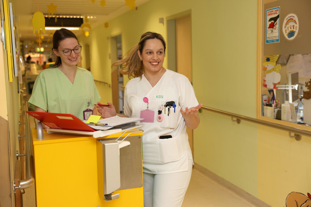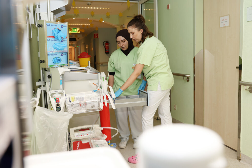 18 angehende Pflegefachkräfte haben die K2 im Klinikum Bremen-Nord seit einigen Wochen zur Schulstation gemacht und kümmern sich dort um die kleinen Patientinnen und Patienten. Auszubildende Betül Kürkcü und Pflegefachkraft Martina Repp geben einen Einblick, wie die Station so läuft.