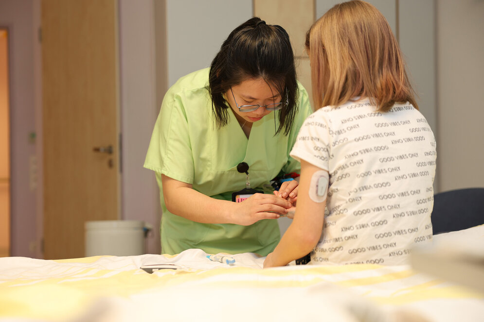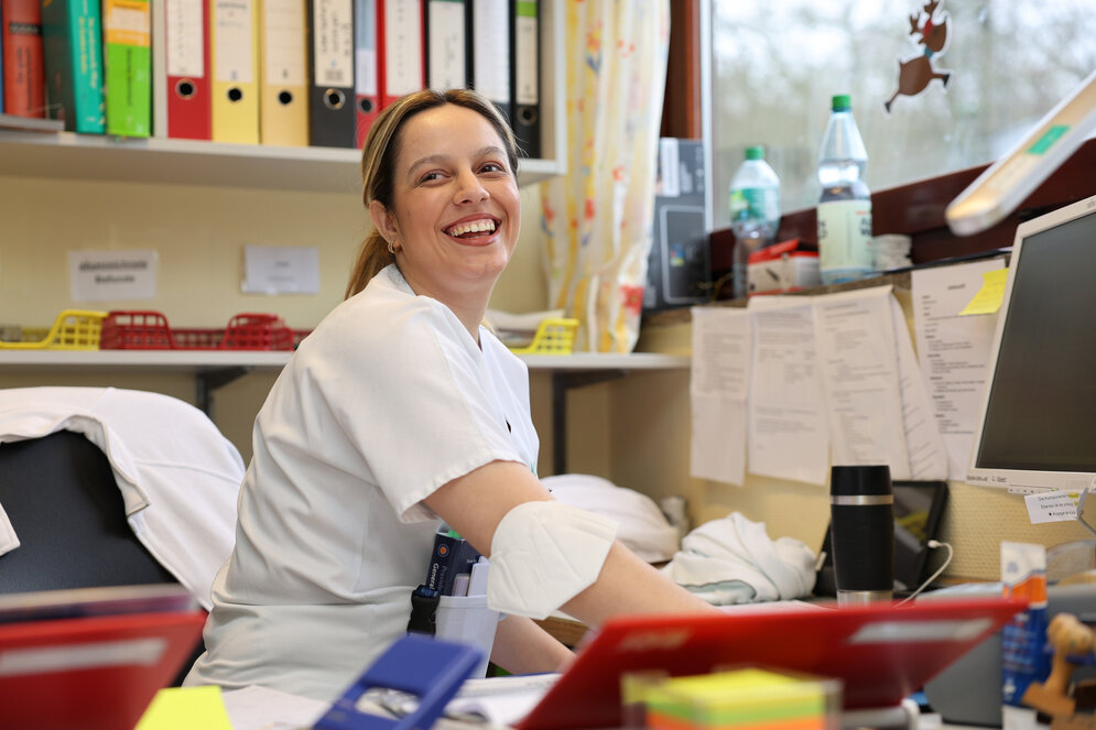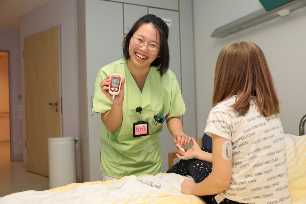 Eine der Kolleginnen aus dem eigentlichen Team der K2 ist Martina Repp. Sie und ihre Kolleginnen haben sich so aufgeteilt, dass immer drei Auszubildende eine feste Ansprechpartnerin im Stationsalltag haben. „Der Kurs ist wirklich wissbegierig – ohne Ausnahme“, findet Repp. Und die Schülerinnen und Schüler hätten auf Anhieb einen guten Draht zu den Kindern auf der Station aufgebaut. „Man merkt, dass viele später selbst einmal im Kinderbereich arbeiten möchten. Und auch bei den anderen, die diese Vertiefung nicht gewählt haben, sieht man, mit wieviel Herzblut sie dabei sind.“