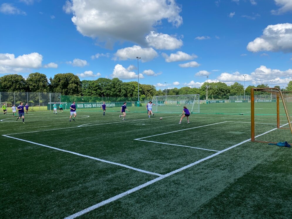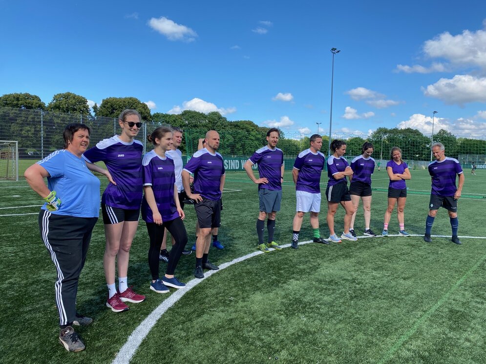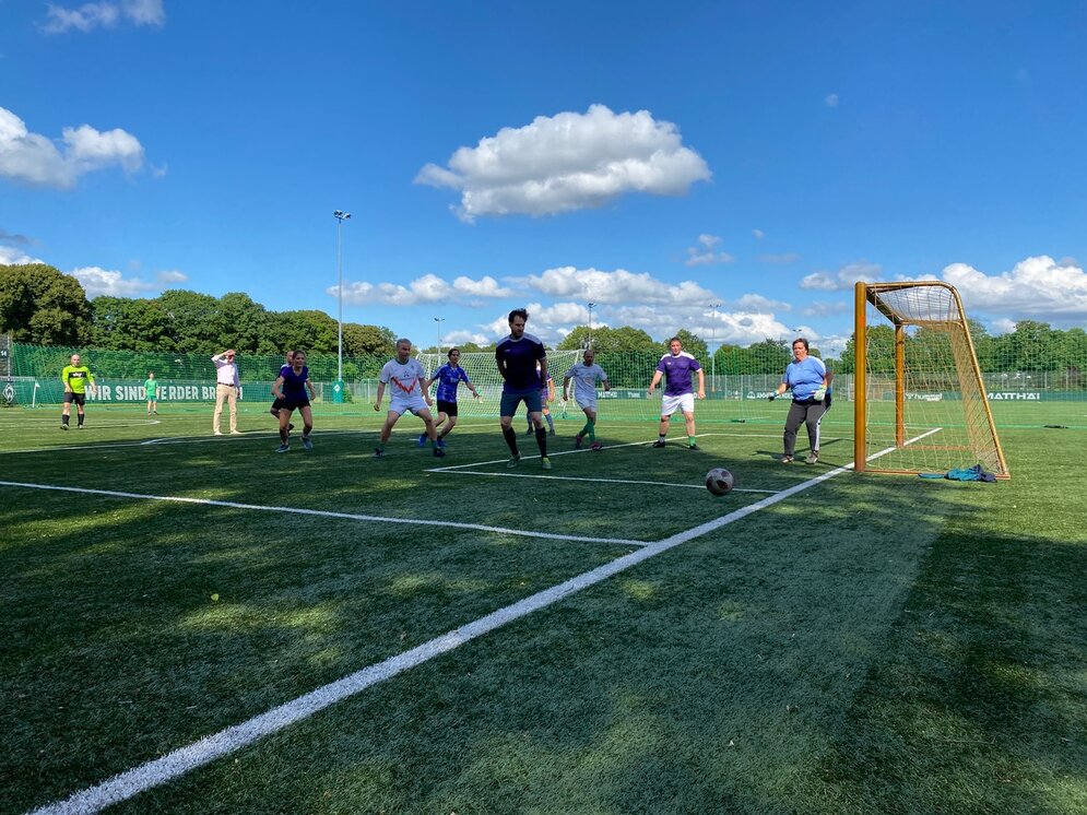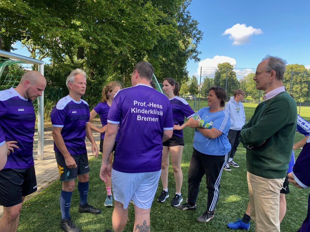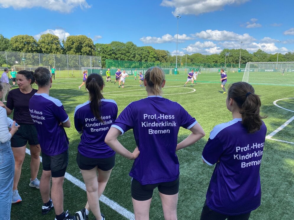 Nach der erfolgreichen Premiere im vergangenen Jahr traten am Mittwoch (19.6.) wieder die Teams des Eltern-Kind-Zentrums Prof. Hess und der Bremer Kinderarztpraxen auf dem Fußballplatz gegeneinander an. Es war der sportliche Höhepunkt eines gemeinsamen Fortbildungstages.