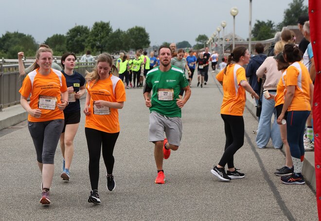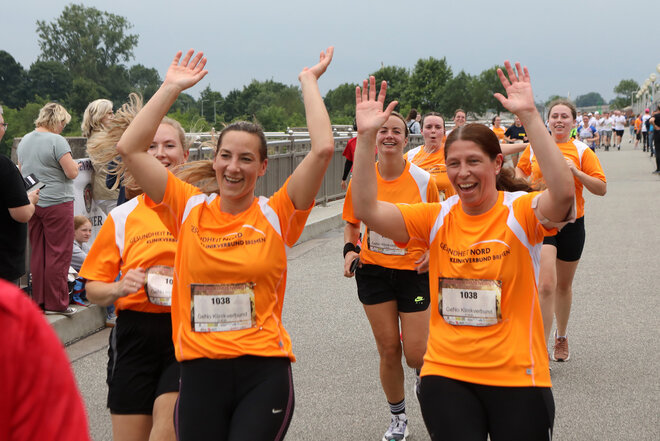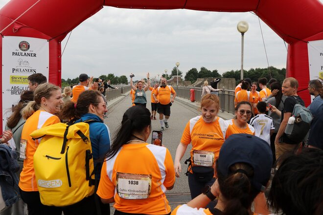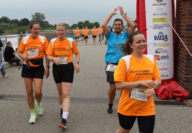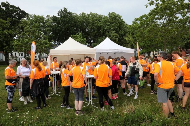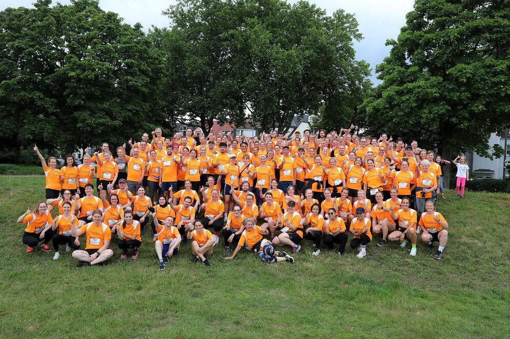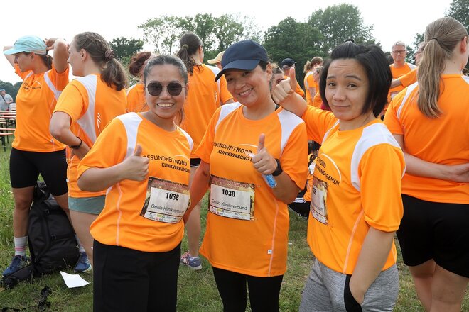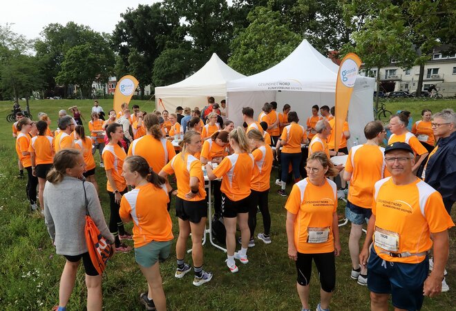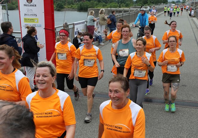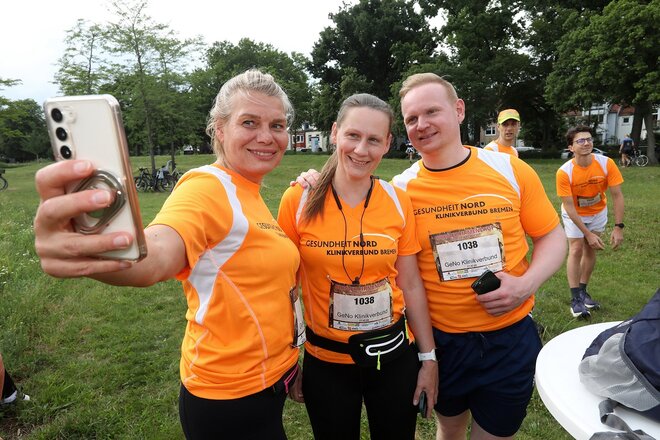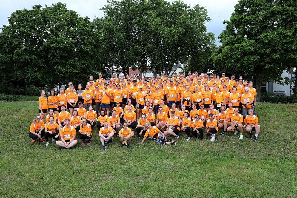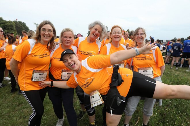 Auch das nicht gerade sommerlichste Wetter und ein drohendes Gewitter konnte die Kolleginnen und Kollegen des Klinikverbunds nicht abschrecken. Mit 130 Teilnehmerinnen und Teilnehmer stellte die Gesundheit Nord am Donnerstagnachmittag das größte Team des Bremer Firmenlaufs zur Spätschicht und setzt bei grauem Himmel mit seinen orangefarbenen Leibchen einen knalligen Farbakzent im Teilnehmerfeld.