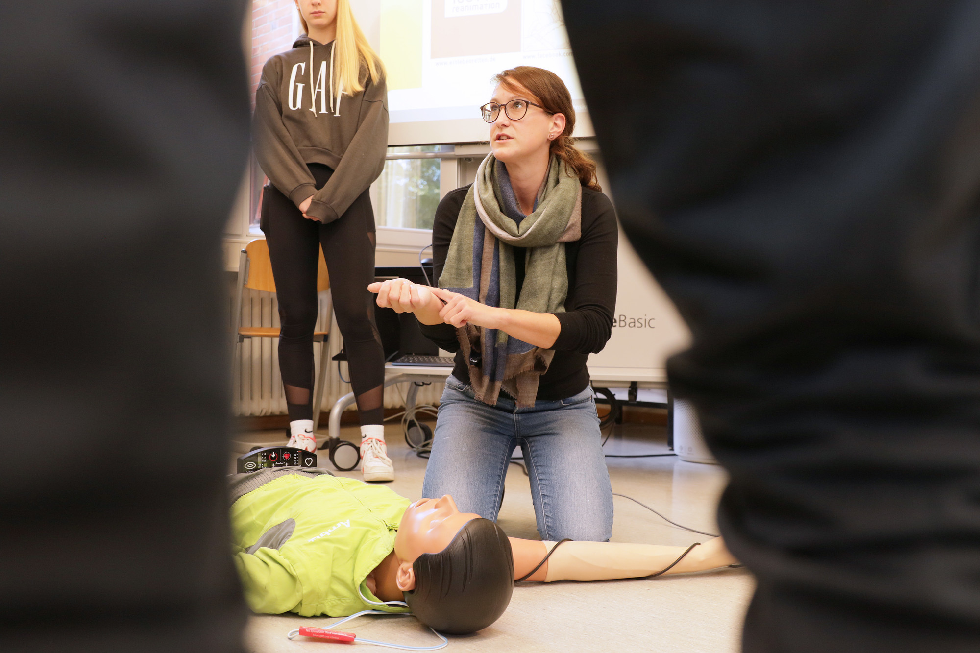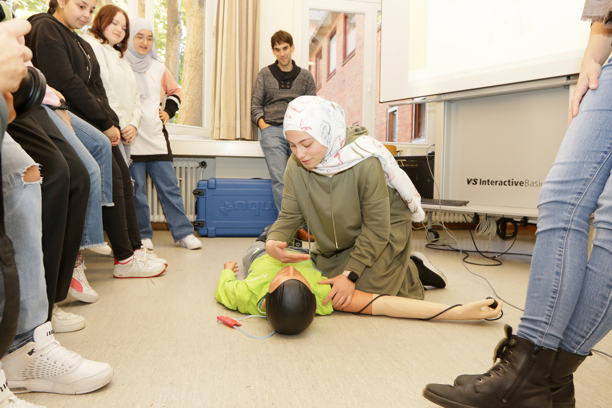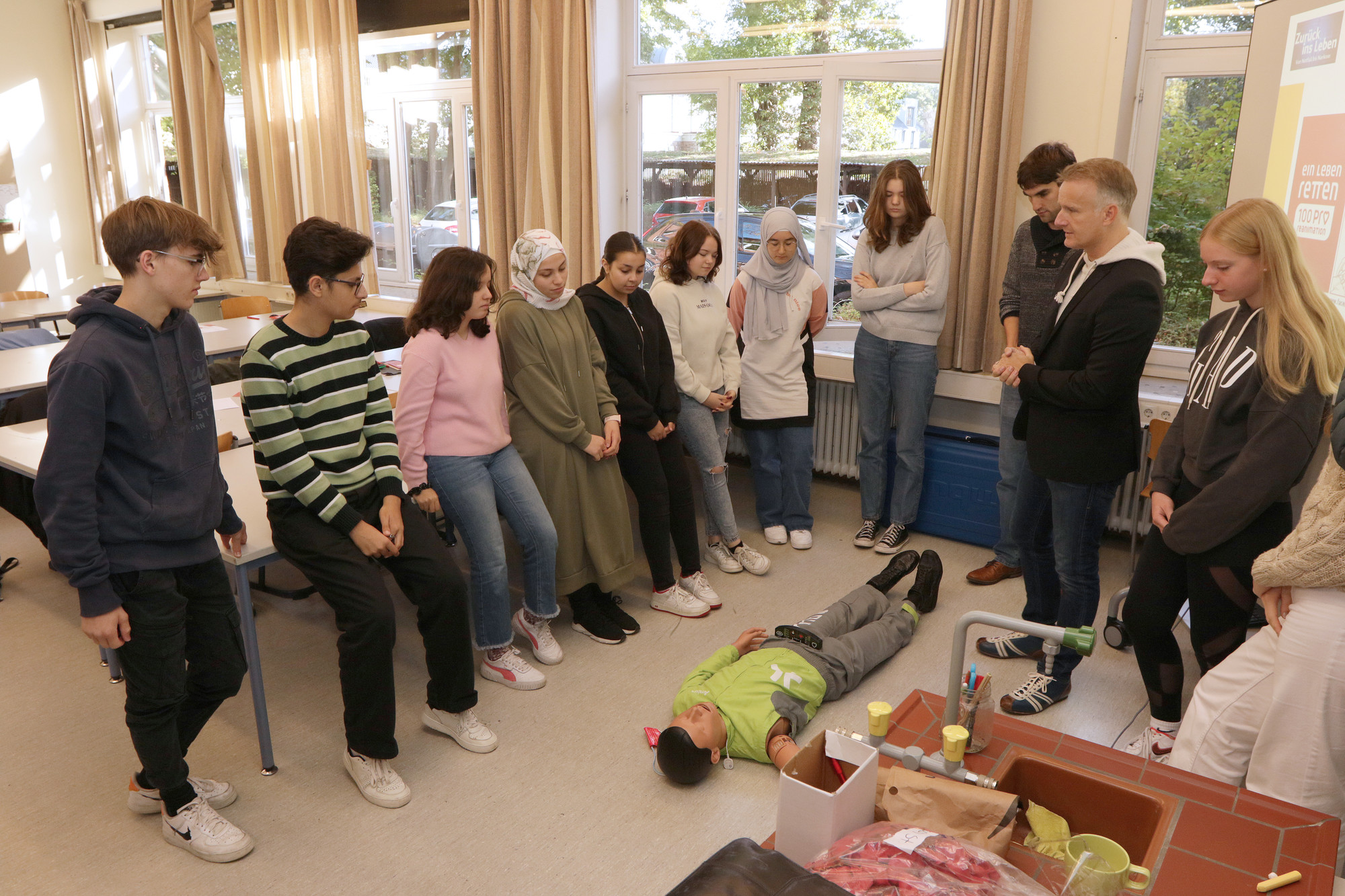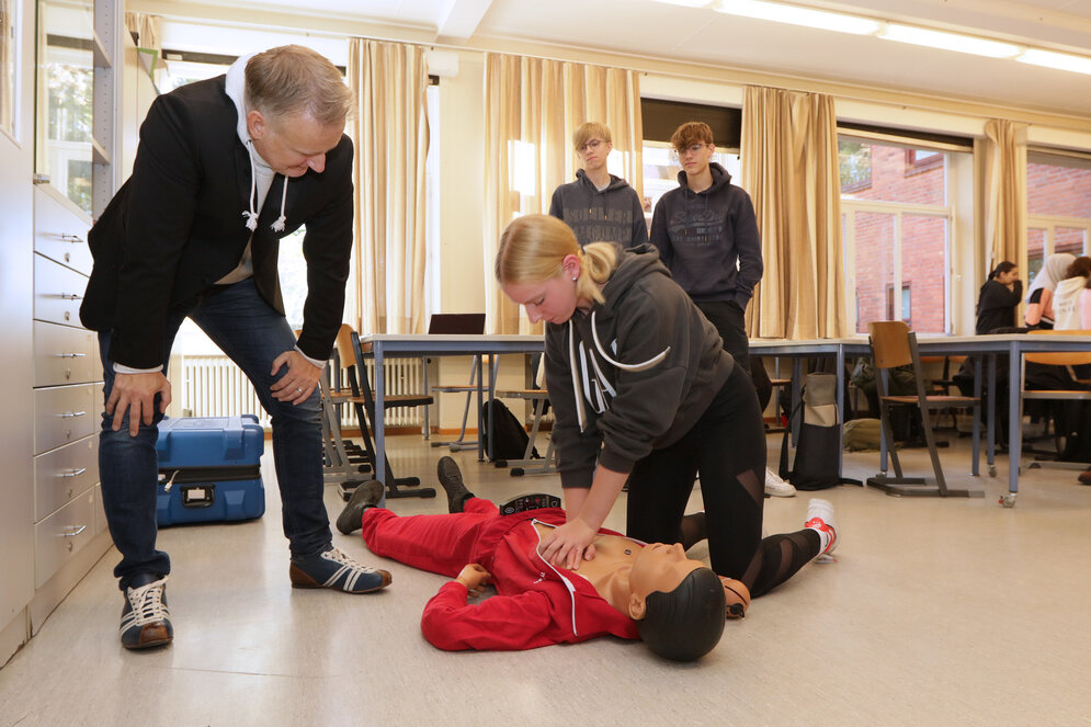 Ein Ärzteteam vom Klinikum Bremen-Nord ist für einen Vormittag lang in die Lehrerrolle geschlüpft und hat mit Schülerinnen und Schülern im Gymnasium Vegesack die Laien-Reanimation geübt.